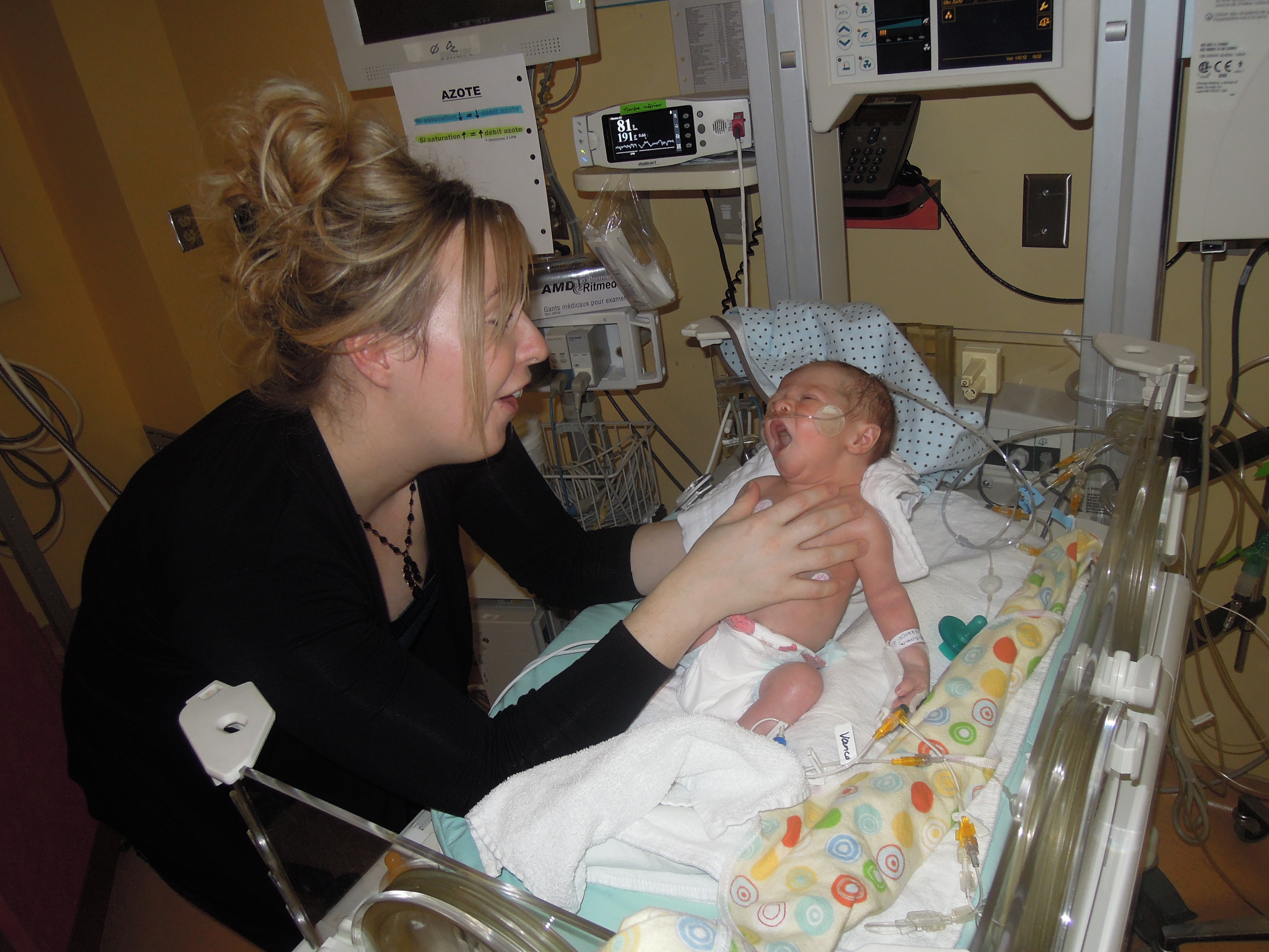 Heureusement, la naissance c’est très bien déroulée. Dans les premières heures de vie de Charles-Antoine, il était important de garder le canal artériel ouvert afin que le sang puisse circuler comme c’était le cas lorsque bébé était encore dans le ventre de maman. Le canal artériel se referme dans les heures suivants la naissance; avec l’aide d’un médicament appelé le Prostin, cela permet de garder le canal artériel ouvert jusqu’à la chirurgie.
