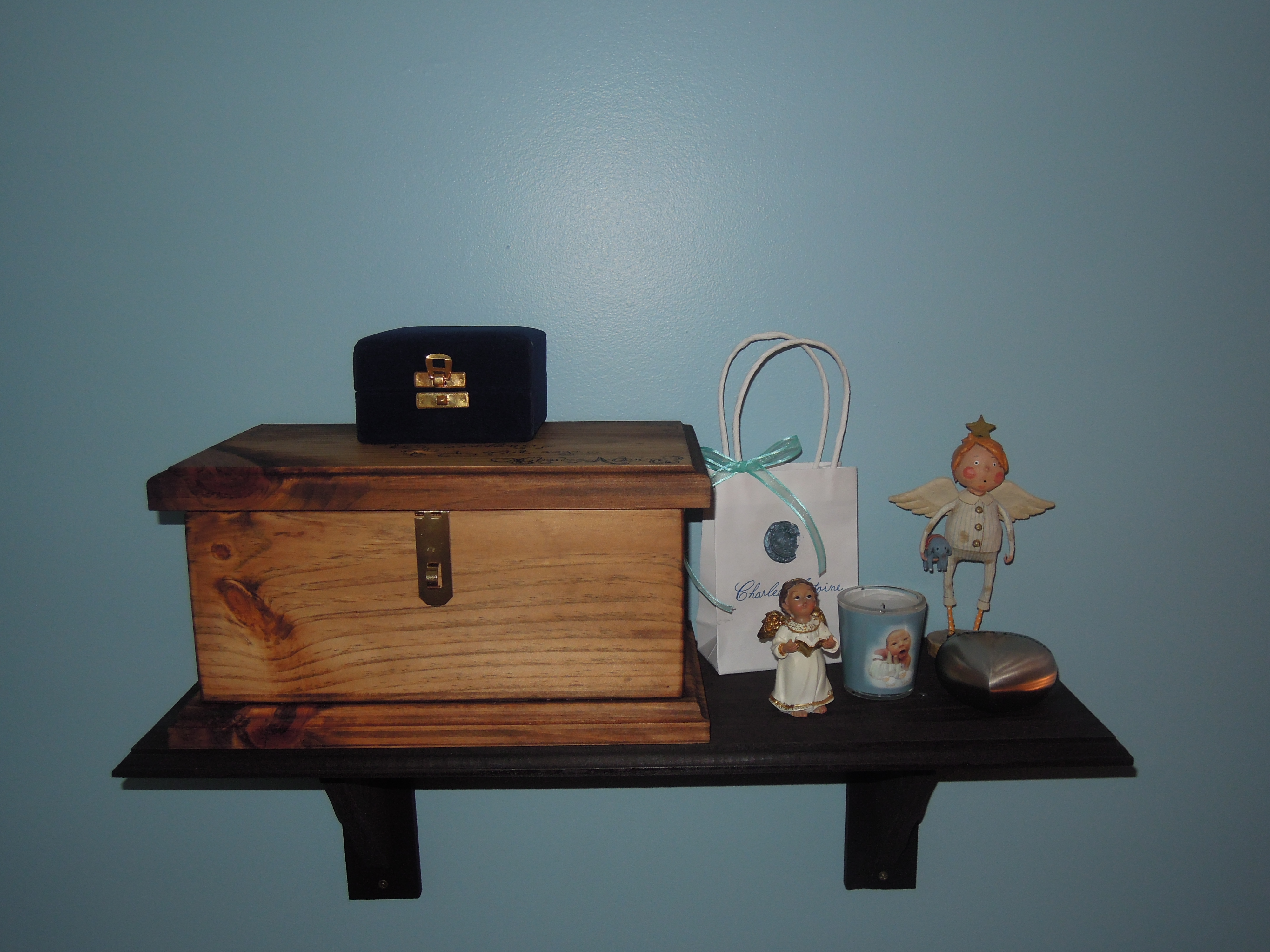 Pour ce qui est des choses que Charles-Antoine aura utilisé pendant sa présence avec nous, nous avons eu la chance de recevoir un merveilleux cadeau, un superbe petit coffre en bois. Ses souvenirs y sont déjà bien en place (voir photo ci-dessous). Merci à Catherine et son conjoint Frédéric (www.rustiques.ca) pour ce cadeau si précieux.