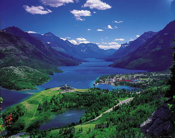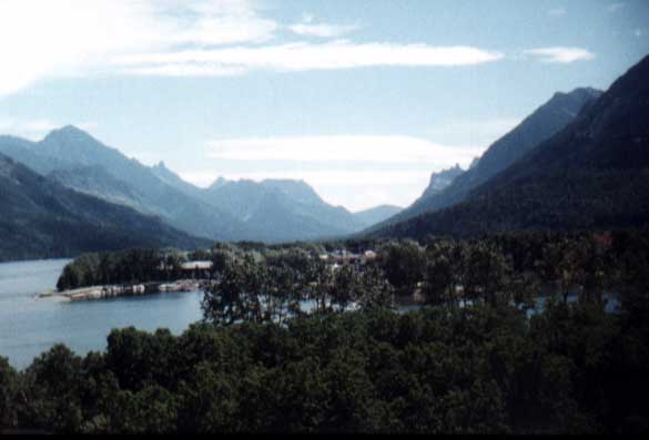 Vue d’ensemble de Waterton Lakes National Park. On y retrouve le Prince of Wales Hotel (j’y ai travaillé) surplombant le village.