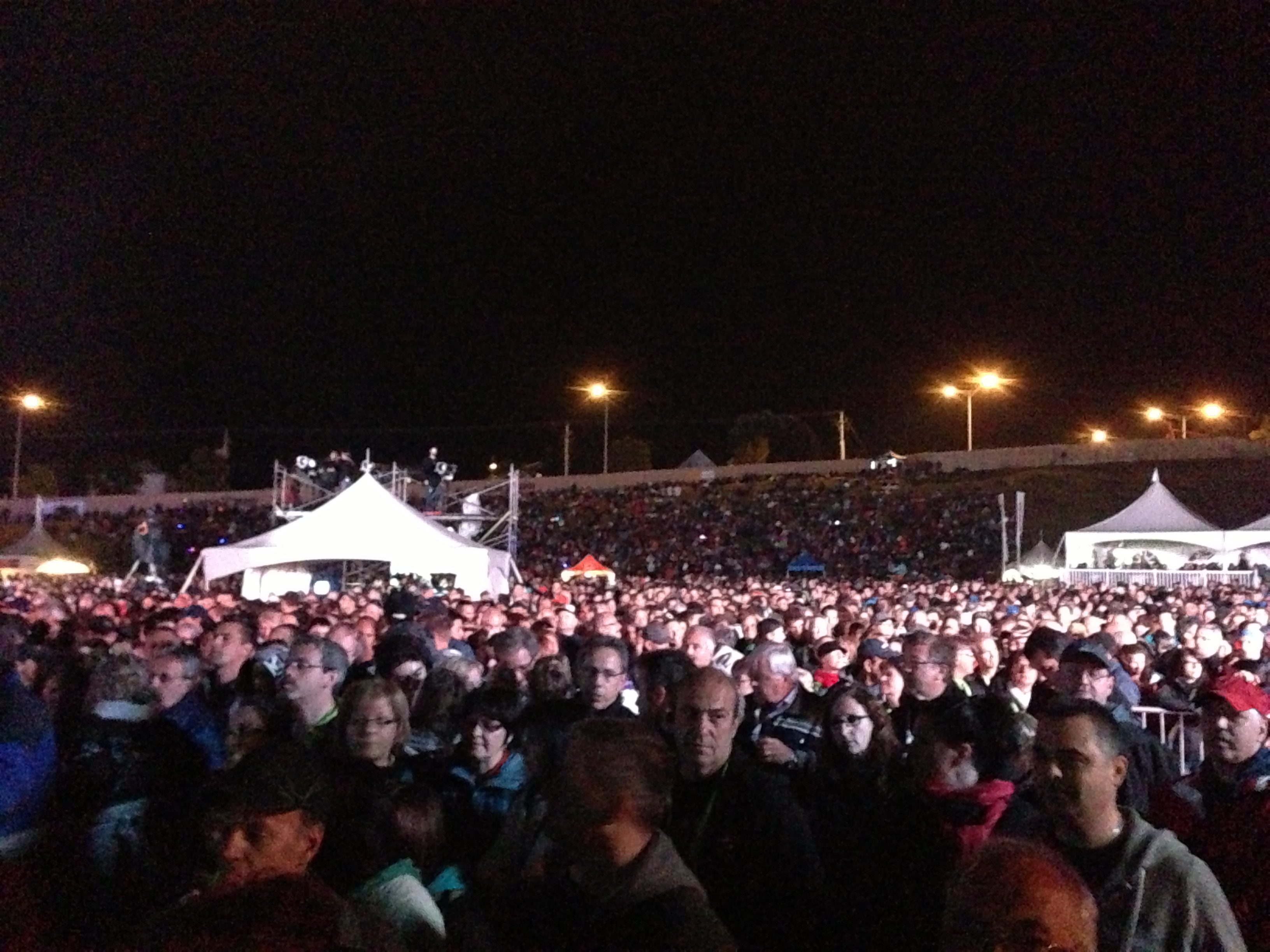 Je suis arrivé au milieu de la prestation du groupe rimouskois Jeffo and the Heads Up qui ouvrait la soirée. Une belle performance de leur part pour une première partie. Ensuite, les gars de Kain ont pris place. Tout allait bien dans le spectacle jusqu’à ce que le chanteur « pète sa coche » après s’être fait dire que ça allait être sa dernière chanson, créant ainsi un gros malaise dans la foule. Je ne raconterai pas l’histoire en détail, vous pouvez la lire ici: Fin de spectacle abrupte pour Kain. La nouvelle a même été reprise par le populaire blogue La Clique du Plateau (lire: Un boys band qui sprend pas pour dla m***). Le gérant du groupe a fait son mea culpa sur la page Facebook des Grandes Fêtes en avouant qu’il est à l’origine de l’erreur et qu’il avait mentionné au groupe qu’il devait jouer 90 minutes plutôt que les 60 minutes prévues au contrat… En tout cas, je vais garder pour moi mon opinion face à cette situation et ce groupe…!