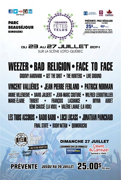 Finalement, nos soirées festives se termineront le samedi avec : WEEZER, Face to Face et The Hunters.